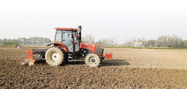 11月9日,在淮陽區(qū)高標準農(nóng)田示范區(qū),一臺東方紅拖拉機牽引著復(fù)式播種機在地里穿梭。