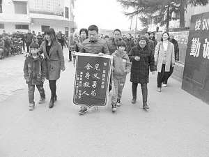 本報訊 (記者 朱紅 文/圖)3月7日本報以《姜振英:冰河救起雙胞胎》為題報道了沈丘縣縣直高中教師姜振英冰河勇救落水雙胞胎的英勇事跡。昨日上午,沈丘縣縣直高中鑼鼓喧天、格外熱鬧。在鑼鼓聲中,得救孩子和親屬一起將一面寫有“見義勇為 舍身救人”的錦旗送到姜振英手中。