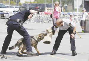 加拿大迎來(lái)全國(guó)警察周      5月9日, 在加拿大溫哥華地區(qū)的素里市,警察在警局開放日活動(dòng)上向民眾示范警犬訓(xùn)練情況。為迎接一年一度的全國(guó)警察周,素里市皇家騎警總部當(dāng)日舉辦開放日活動(dòng),向民眾展示警方裝備及介紹警隊(duì)日常工作。新華社發(fā)