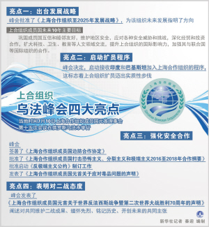 烏法,見證金磚國家新開發(fā)銀行籌備工作全面展開,應(yīng)急儲備安排正式啟動(dòng);見證上合組織成立14年來首次擴(kuò)員,印度和巴基斯坦加入上合組織的程序啟動(dòng),白俄羅斯成為觀察員國,阿塞拜疆、亞美尼亞、柬埔寨、尼泊爾成為對話伙伴國……新興和發(fā)展中國家伙伴關(guān)系日益密切。